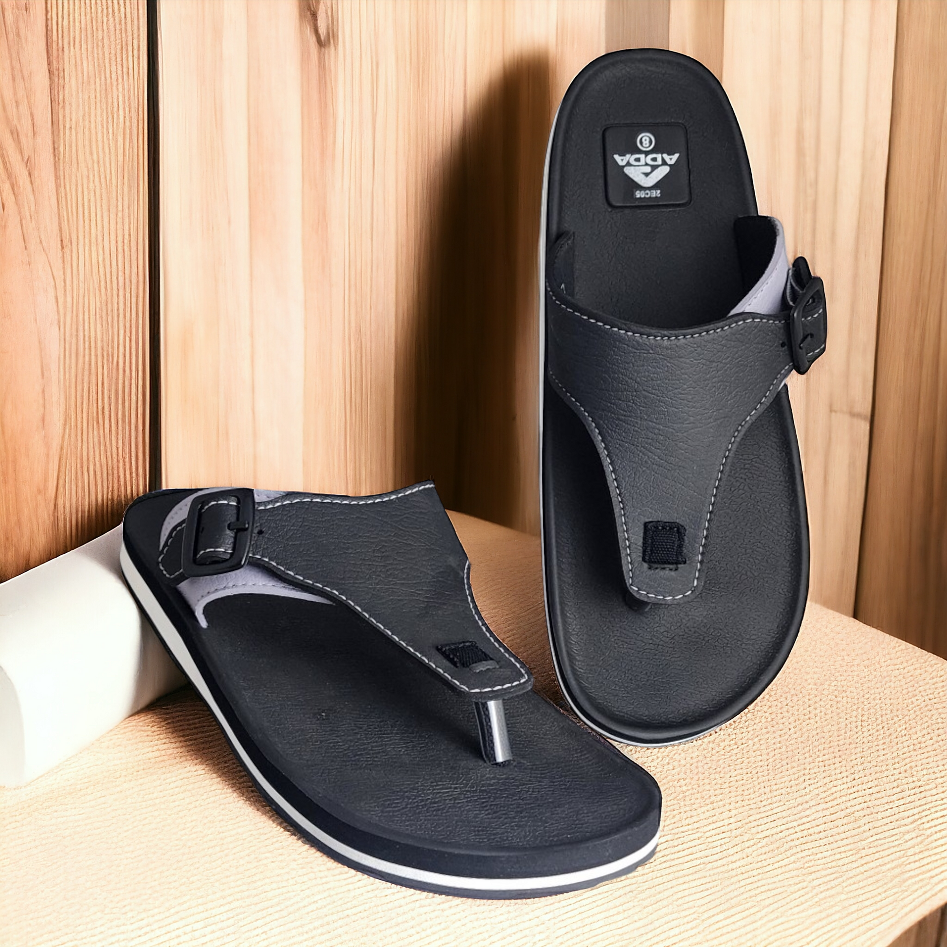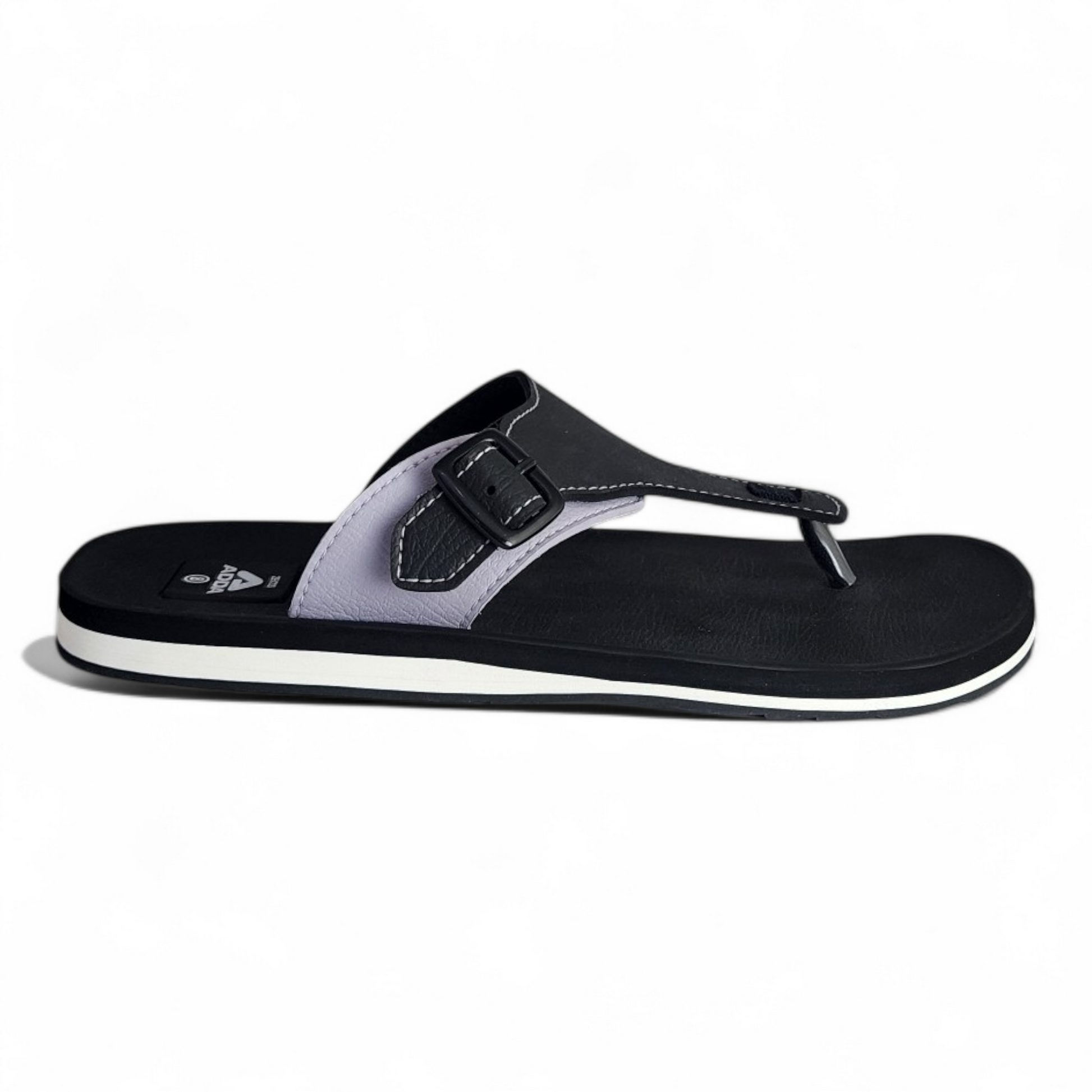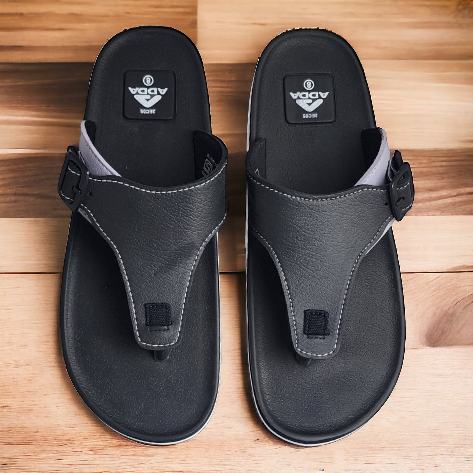 This sleek black slipper/flip flop, the ADDA A1 BLACK/GREY Men's Slipper/Flip flop, is the perfect go-to choice for effortless style. Its design is minimal and refined, featuring a sleek buckle. Made with a PVC and Rexin upper and a sturdy rubber outsole, these slippers provide both comfort and durability on any terrain. Perfect for a casual day out or lounging, these men's flip-flops combine comfort with attention-grabbing style.