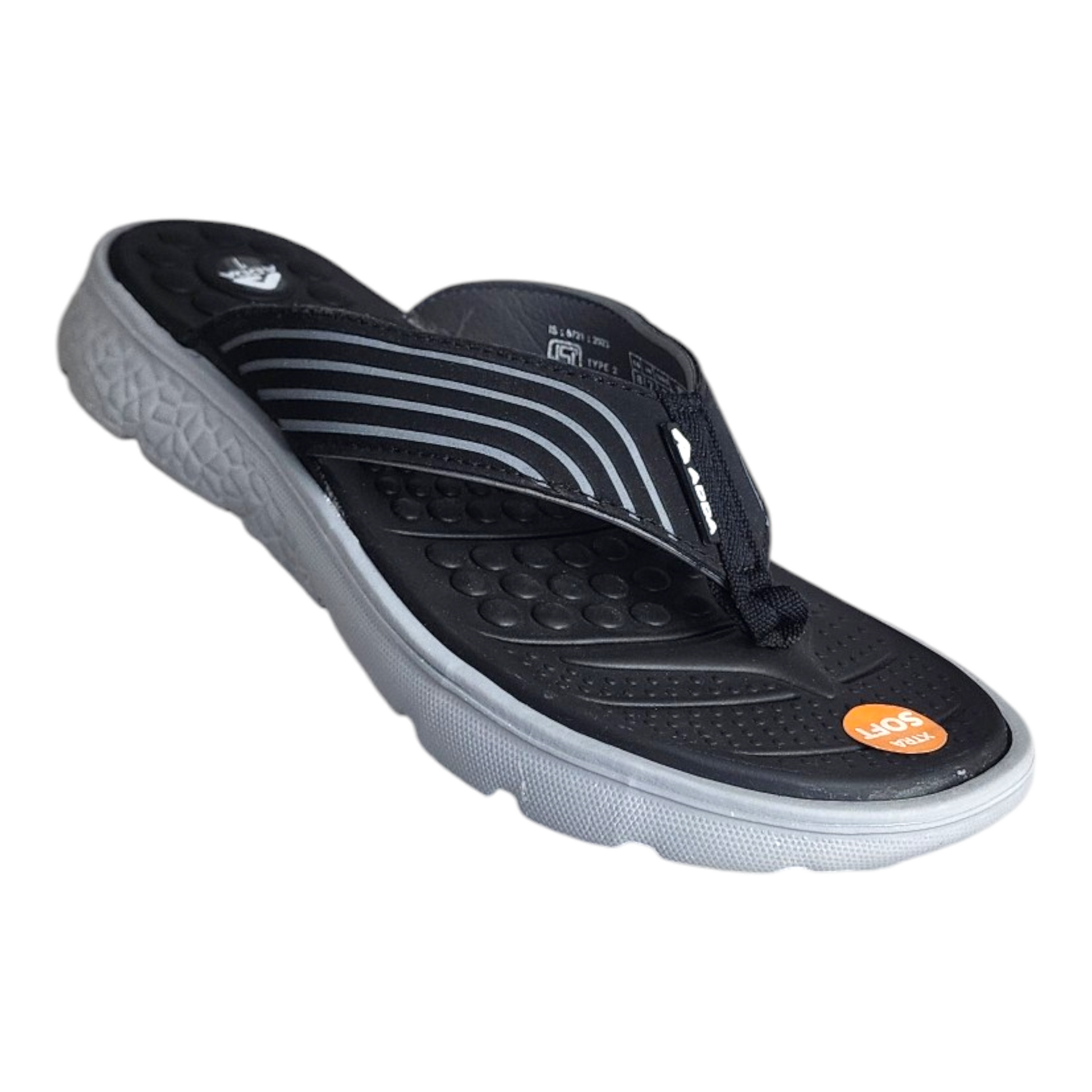 Enhance your style with the fashionable ADDA ARROW2 BLACK/GREY Men's Slipper/Flip flop by Campus. The elegant EVA upper adds a touch of sophistication and the slip-resistant sole ensures safety from unexpected slips.