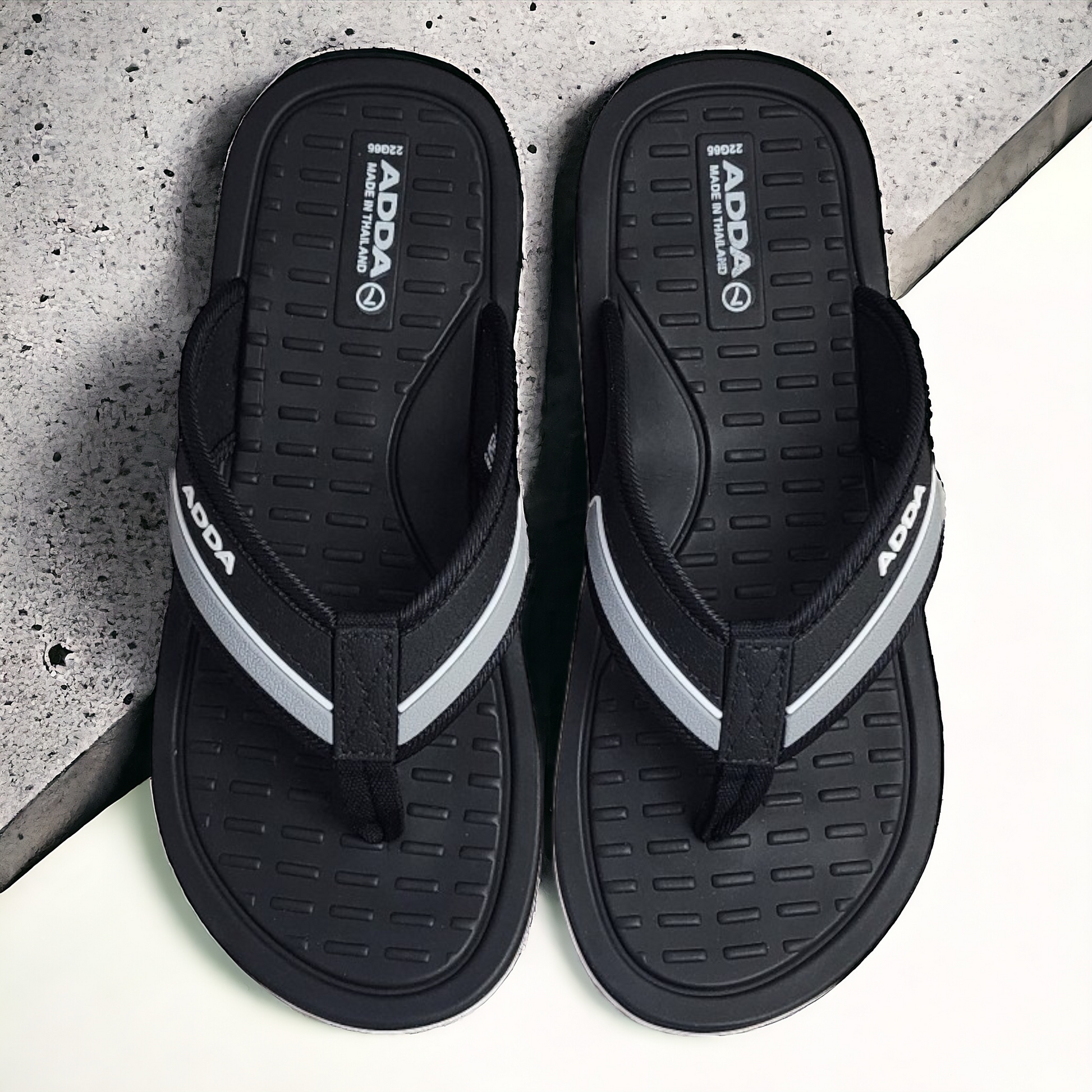 Elevate your everyday look with ADDA DEFENDER3 BLACK Men's Slipper/Flip flop. These slides perfectly balance simplicity with sophistication, featuring a polished Rexine upper and lightweight rubber sole. The scientifically-engineered anti-slip sole provides superior traction, while the padded EVA insole ensures all-day comfort. With a versatile black color, these stylish flip flops are ideal for any occasion.