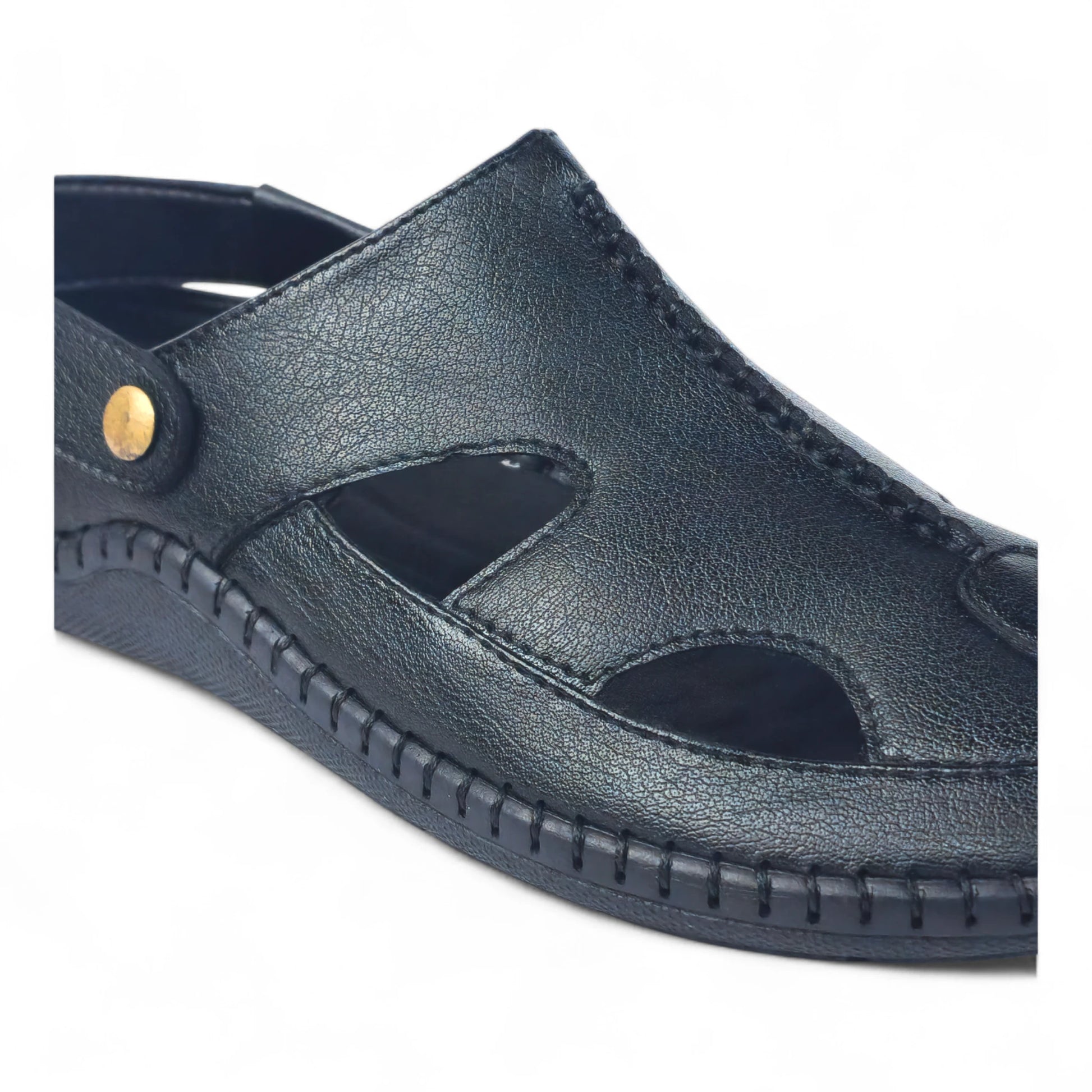 Men’s black slip-on sandal crafted from soft leather, featuring an adjustable strap. Ideal for ethnic wear, mojri style, and Navratri fashion occasions.