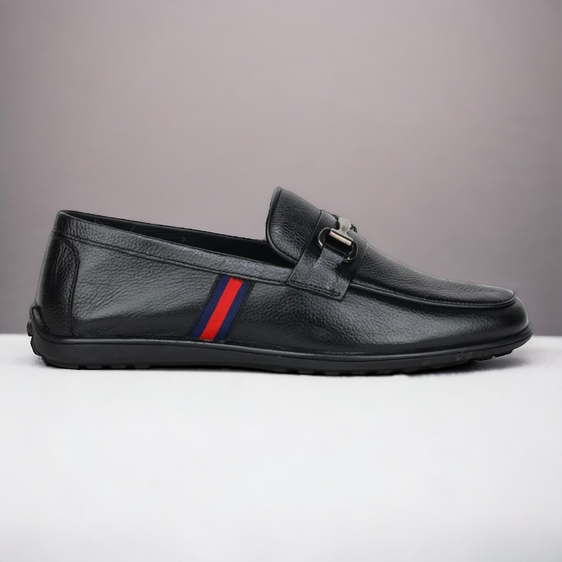 Enhance your shoe assortment with these Men's Loafers in black leather. The sleek texture and dark color provide an elegant appearance, suitable for formal occasions and dressy-casual events. Modernize the traditional loafer design with the statement buckle on the top, and enjoy all-day comfort with the slip-on style. Whether you're dressing up for work or a casual outing, these loafers will effortlessly elevate your style.